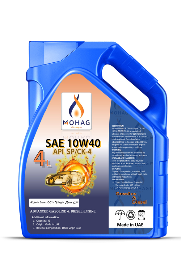 MOHAG Motor Engine Oil 10W-40 is an advanced technology motor oil providing excellent performance in passenger car engines. It is formulated to ensure excellent viscosity retention and superior engine protection under all driving conditions. Guarantees easy cold start and fuel economics due to its extreme fluidity at low temperatures and maintains a very resistant oil film at high temperatures. Recommended for gasoline, turbo charged and multi valved engines