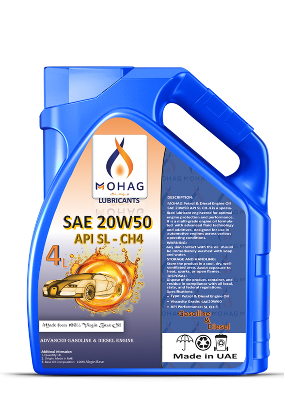 MOHAG Motor Engine Oil 20W-50 designed to keep your engine running like new by providing exceptional wear protection, cleaning power and overall performance. High performance oil recommended for all modern Diesel On-Road (trucks, buses) and Off-Road (public works agriculture machines) engines requiring API CH-4 performance. suitable for naturally aspirated or turbocharged engines. heavy duty vehicles and particularly recommended under severe conditions.